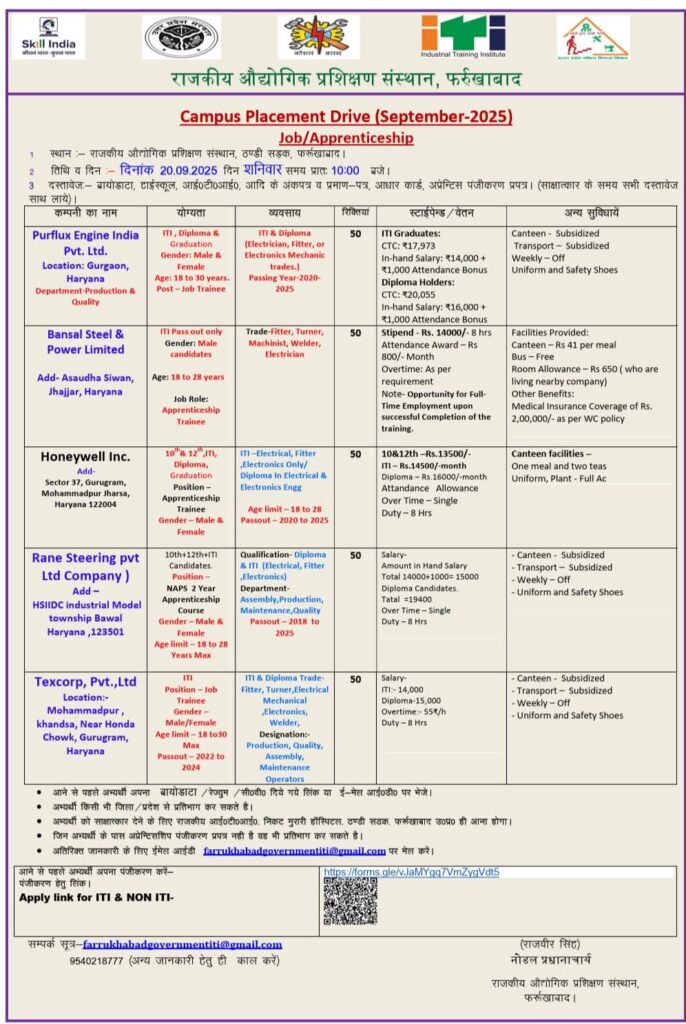 फर्रुखाबाद उत्तर प्रदेश में 20 सितंबर 2025 को रोजगार मेले का आयोजन करवाया जाएगा जिसमें फर्रुखाबाद के शासकीय औद्योगिक प्रशिक्षण संस्थान में यह रोजगार में लेकर आयोजन करवाया जाएगा जिसमें पांच बड़ी कंपनी जो कि भारत की प्रतिष्ठित कंपनी में से एक है इन कंपनियों में 400 से अधिक रिक्त पदों की पूर्ति हेतु महिला एवं पुरुषों की आवश्यकता है जिसके लिए मौखिक इंटरव्यू लिखित परीक्षा एवं दस्तावेज सत्यापन के आधार पर कंपनी में आपको जॉइनिंग दिया जाएगा और चयनित हुए छात्रों को परमानेंट नौकरी भी प्रदान किया जाएगा और यदि आप इस कंपनी के कैंपस प्लेसमेंट में भाग लेने के लिए जाना चाहते हैं रोजगार मेले में भाग लेने के लिए आपको अपने समस्त दस्तावेज लेकर सुबह 10:00 बजे से पहले प्रातः आपको इंटरव्यू वाले एड्रेस पर चले जाना है। नीचे आर्टिकल में हमने आपको संपूर्ण जानकारी विस्तार पूर्वक बताया गया है जिसको आप पढ़कर के पूरी जानकारी को प्राप्त कर सकते हैं।