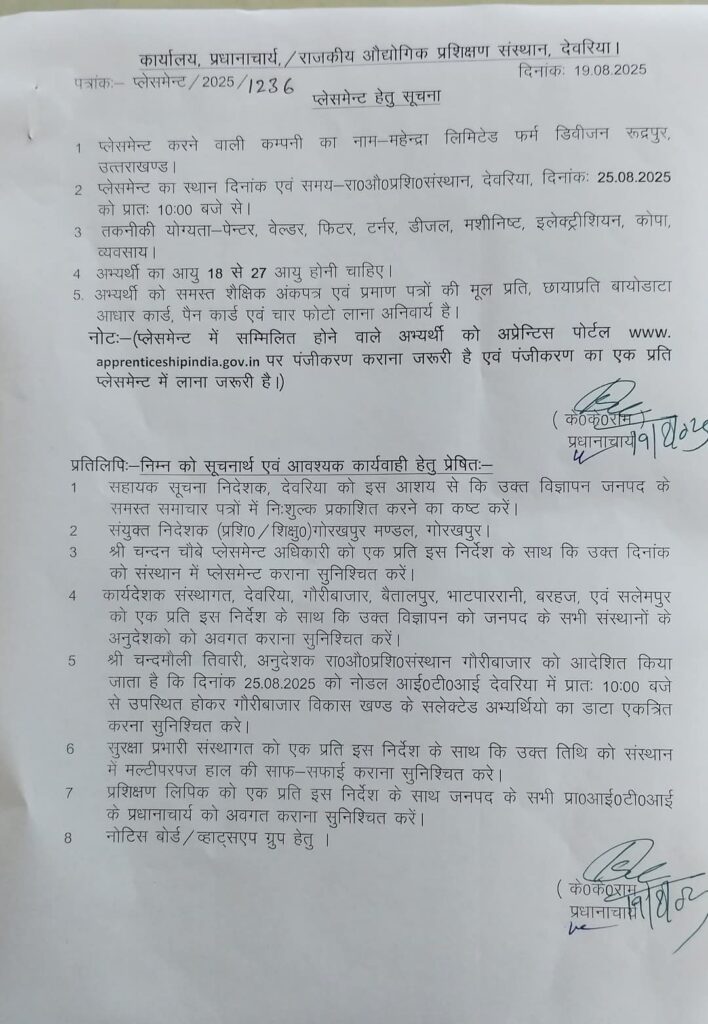 Interview Address:- Government Industrial Training Institute Deoria Uttar Pradesh.