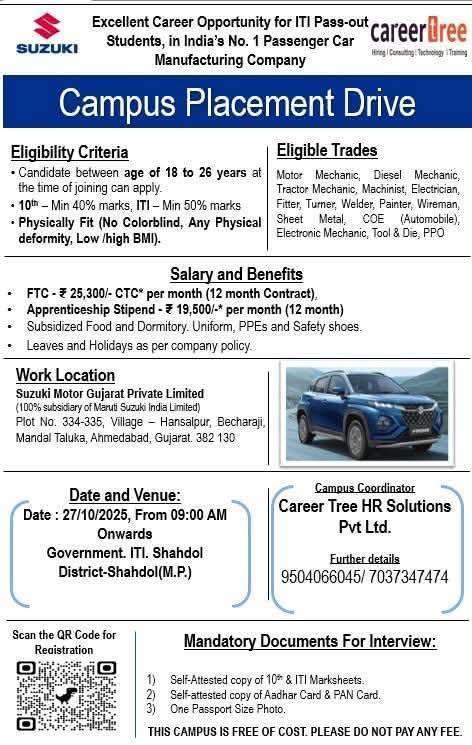इस कंपनी का Campus Placement Drive 27 अक्टूबर 2025 को आयोजित की जाएगी इसके लिए आपको दिए गए पते पर अपने समस्त दस्तावेज लेकर के इंटरव्यू में जाना होगा। यह ITI Pass-out बचों के लिए एक excellent opportunity साबित होगी। यदि आप भी एक अच्छी नौकरी प्राप्त करना चाहते हैं तो मध्य प्रदेश एवं अन्य सभी राज्यों के छात्रों – इस बेहतरीन नौकरी का अवसर हाथ से जाने न दें । इसमे 18-26 आयु वर्ग के महिला एवं पुरुष सभी अभ्यर्थियों को नौकरी का अवसर प्रदान किया जाएगा ।