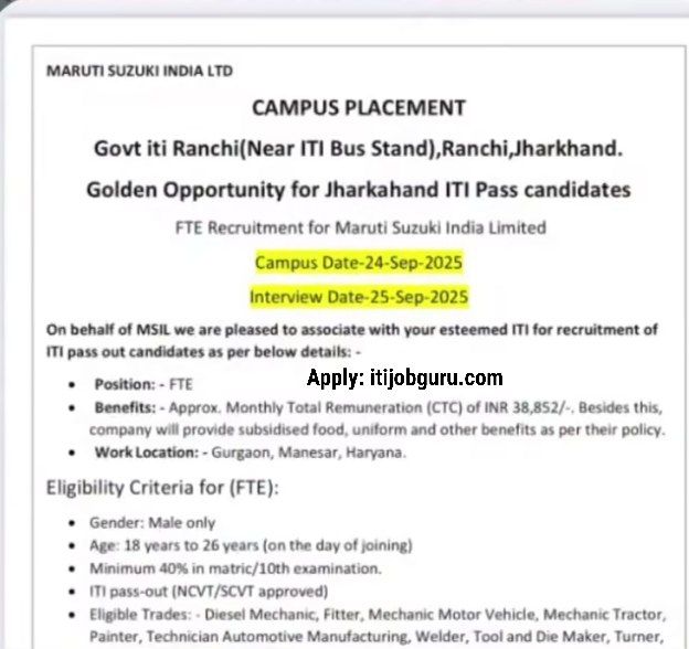 Maruti Suzuki Company ITI Off Campus 2025 – मारुति सुजुकी इंडियन प्राइवेट लिमिटेड कंपनी खरखोदा सोनीपत प्लांट के लिए नई भर्ती का नोटिफिकेशन जारी किया गया है जिसमें सभी राज्यों के छात्रों को रोजगार मेला में भाग लेने का अवसर दिया जाएगा। कंपनी में आपको बेहतरीन नौकरी एवं अन्य सुनहरा अवसर दिया जाएगा इस कंपनी का कैंपस प्लेसमेंट 24 सितंबर 2025 को राजकीय उद्योग की प्रशिक्षण संस्थान झारखंड में आयोजित किया जाएगा इसके लिए सब आप इसका आधिकारिक नोटिफिकेशन को देख सकते हैं जिसमें संपूर्ण जानकारी विस्तृत प्रकार से बताई गई है।